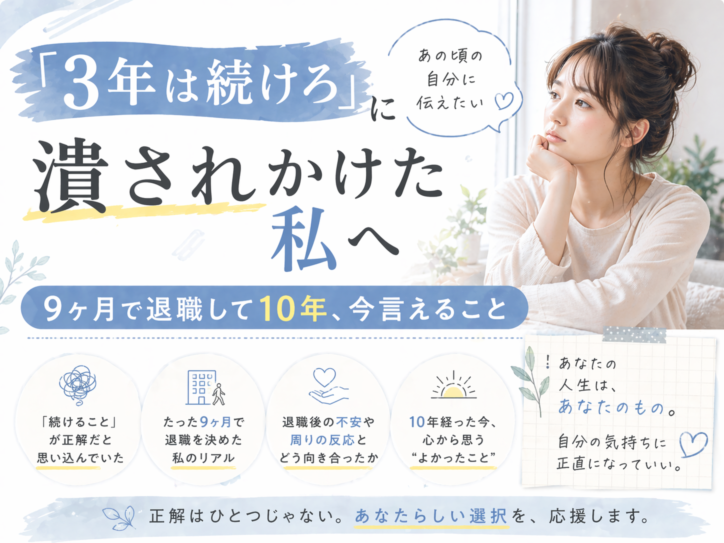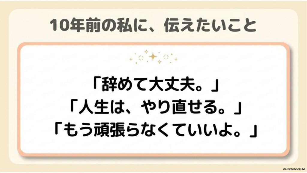 辞めたあと、あなたは10年後、穏やかな日常を生きている。食事を美味しく食べて、ちゃんと眠れて、笑える日々を生きている。