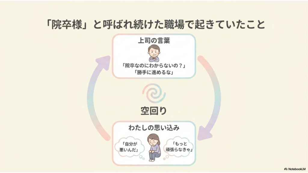 質問をすれば「そんなこともわからないの?」と言われ、質問しなければ「勝手に進めるな」と叱られる。何をしても「院卒様」という枕詞がついてまわる。