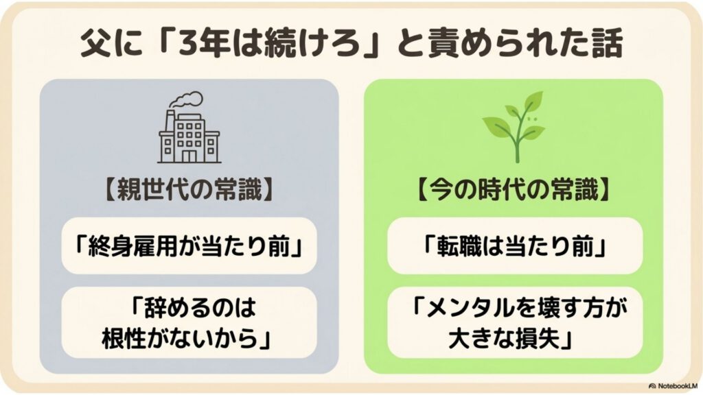 後になって思うのは、父の世代の「3年は続けろ」という言葉は、終身雇用が当たり前だった時代の価値観だということです。